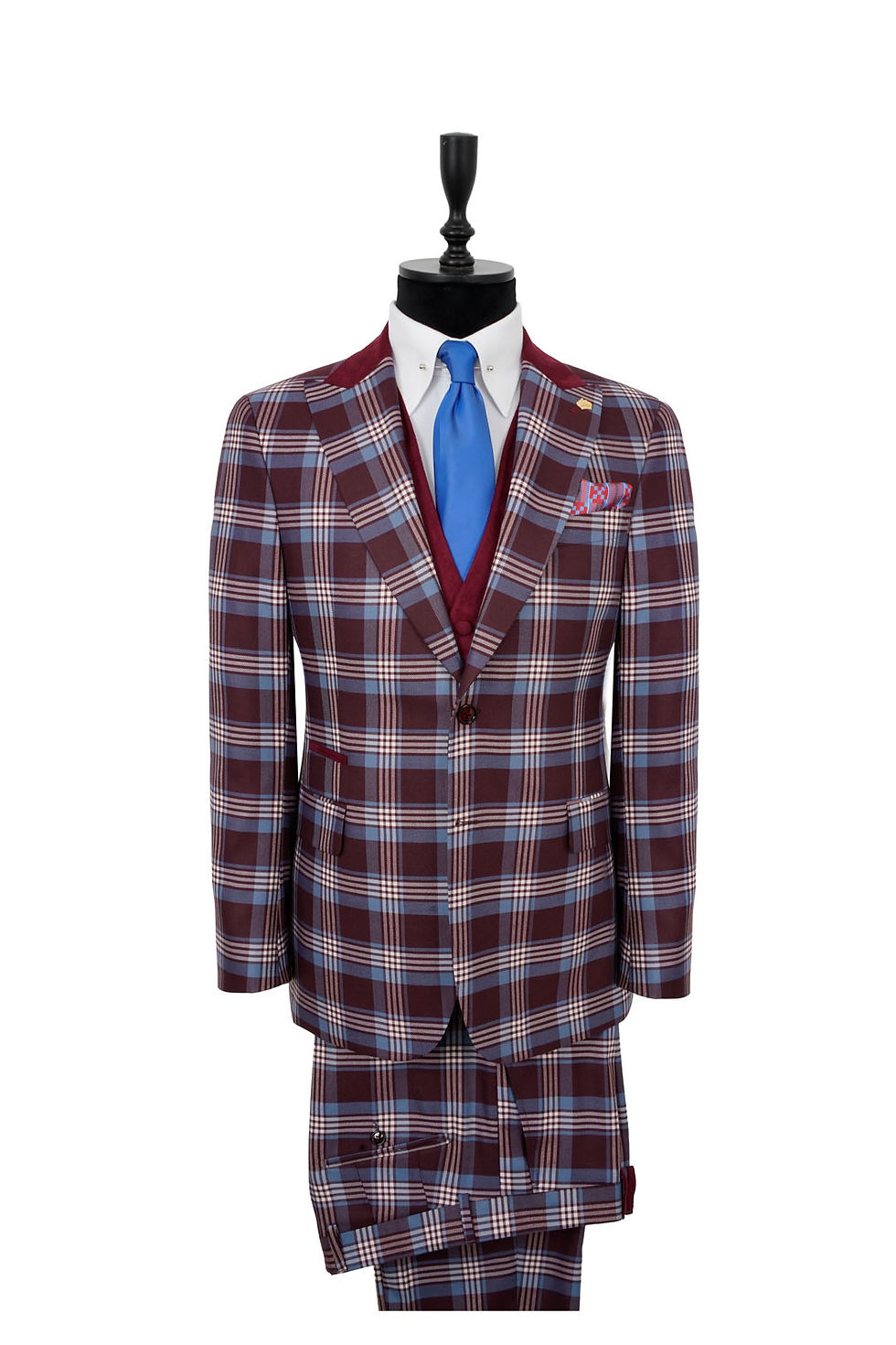 Men's Suit Peak Lapel Burgundy-White Checked Wool